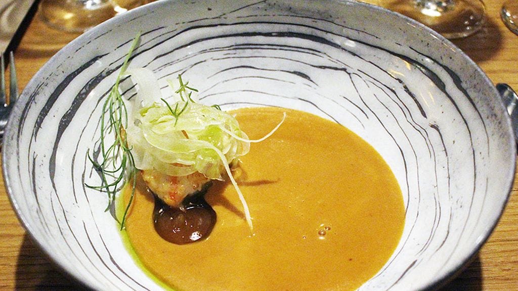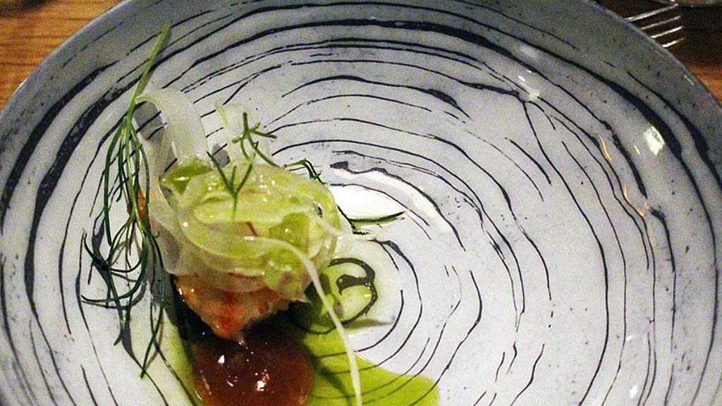 Varsinainen alku on vahva. Paitsi tasoltaan, myös maultaan. Kuningasrapukeittoa misogeelillä, paistetulla kuningasravunjalalla, kafferlime-marinoidulla fenkolilla ja meriruoholla. Syvä, voimakas ja suola suolanrakastajallekin tapissa. Merelliset sävyt puskevat taustalta hienosti läpi. Kenties voimakkain syömäni syömäni alkuruoka ikinä. Mutta erinomainen. Rohkea. Kaikki nupit kaakossa heti kättelyssä. Lasissa herkullisen raikashappoinen, sitruksinen ja pehmeän mineraalinen Gresser Duttenberg Riesling 2014 jää hiukan jalkoihin stydeille aromeille.