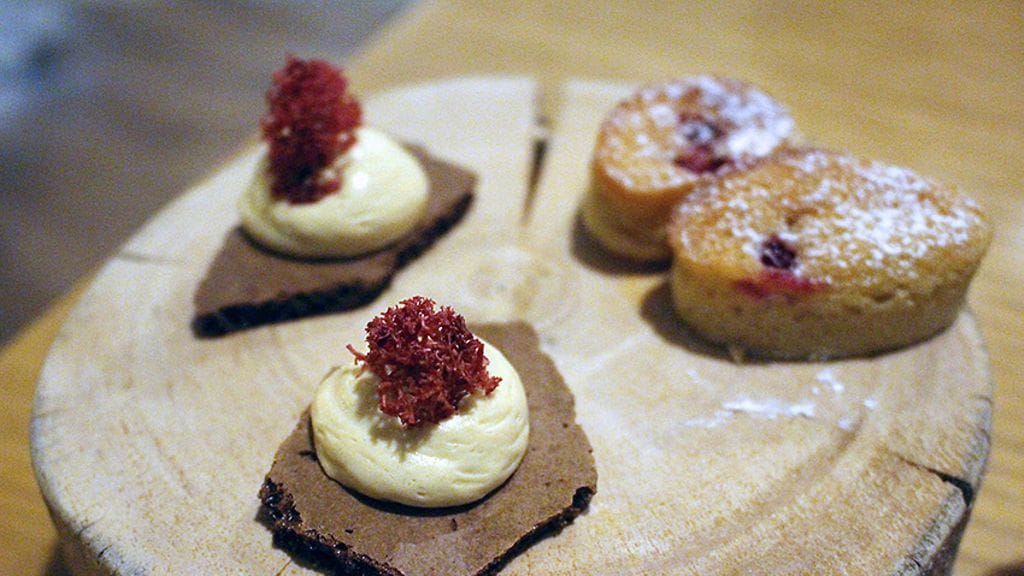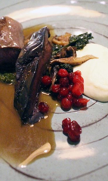 Pääruokaan. Sallan villiporoa, miedosti savustettua poronsydäntä, lehtikaalia, selleripyreetä, pikkelöityä puolukkaa ja metsälientä mm. kuusesta, kävystä ja sienestä). Syviä ja tummia sävyjä ilman ylilyöntejä. Jotenkin tuli tunne, että annos halusi viedä ajatuksen pitemmälle kuin vei, mutta saattoi silti tarpeeksi pitkälle. Mietin paljon, olisinko halunnut tähän vielä jotain säväytystä, mutta pikkelipuolukat lopulta hoitivat sen puolen. Havahdun vaimon voihkinaan kaapiessaan kastiketta. Viereen saapuu chef Mäntykangas kysymään, miltä maistuu. Vaimo parkaisee kastikkeen loppuvan. Kuulemma taivaallista. Maistan erikseen. Onhan se pirun hyvää. Chef kipaisee keittiössä ja tuo mukanaan kastikekattilan santsaamista varten.