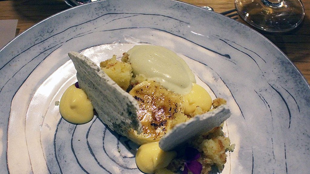 Jälkkäri suksi kuuseen. Sitruunakakkua, kuusenkerkällä maustettua creme bruleeta, kuusenkerkkäjäätelöä ja kuusimarenkia on raikkaan hapokas ja makea kokonaisuus, joka tasapainoilee tyylikkäästi hapon ja makeuden välimaastossa. Itselleni hapot pääsivät hitusen turhan paljon voitolle, mutta vaimo oli eri mieltä ja arpoi oliko se parasta menulla. Onneksi marenkilastut olivat pystyssä eikä sellaisena fkin trendikkäänä kantena.