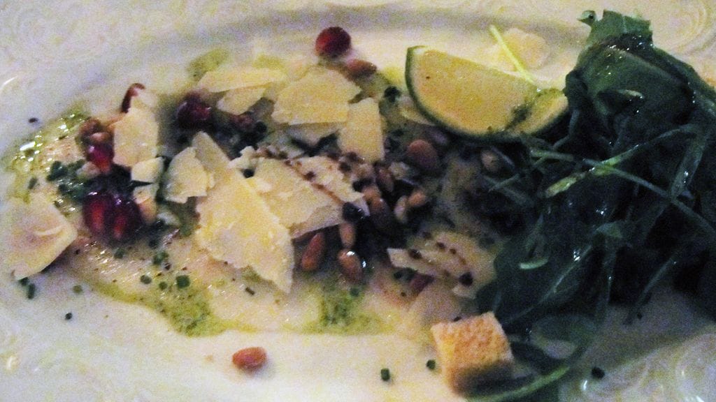 Alkuun meille tuodaan amuche bouchena mätiherkku leivän päällä. Bongaan kaninmaksaa grillattuna ja moussena metsäsienipiiraan ja sipulihillokkeen kera. Pakko maistaa, kun tuollaista ekaa kertaa listalla näkee. Vaimo nappaa merikrotti-carpaccion mintun, oliiviöljyn ja rucolan kera. Myöhemmin muistamme, että sekin fisu oli WWF:n punaisella listalla. Damn! Täytyypä blogata aiheesta, niin muistaa ulkomaisetkin lajit paremmin.