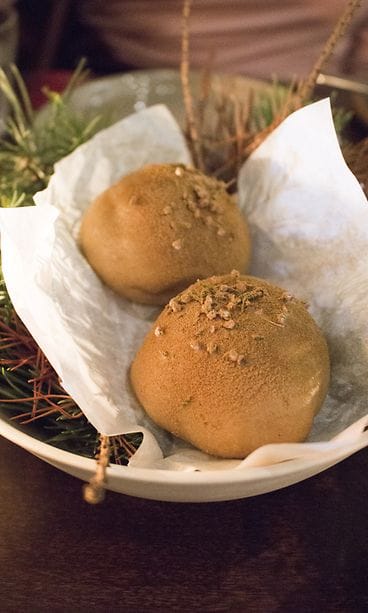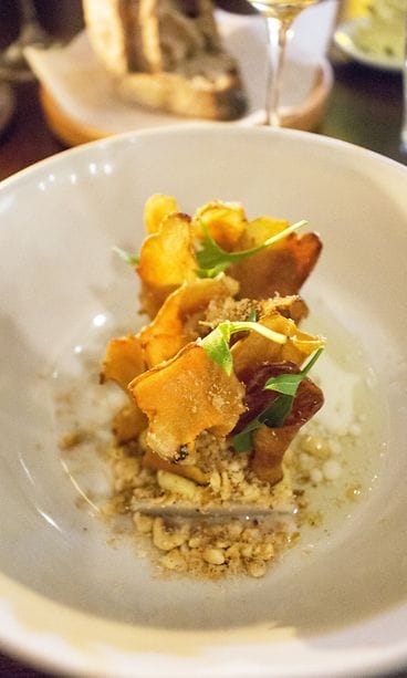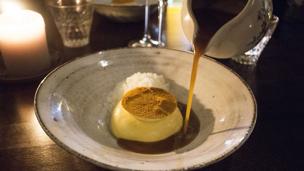LEIPÄ. Täydellisyyttä hipova, rapeakuorinen ja kuplia täynnä oleva hapanjuurileipä ravintoloitsijoiden uunituoreesta kalliolaisesta leipomosta, The Waysta. Höysteeksi tillillä maustettuja auringonkukansiemeniä, kevyesti tillistä voita ja karhunlaukkasuolaa. Lisäksi ensimmäinen extra-annos, Pehmeää kananmaksaa, syysomenaa ja mesiangervoa. Leivän päälle levitettävä kananmaksa on herkullisen lempeää ja pyöreää. Kun uuniomenasta leikkaa siivun ja maistaa maksatahnaa sen kanssa, pääsee kerrasta jyvälle Grönin ideaan. Päällepäin hyvin yksinkertaiset elementit muodostavat yhdessä jotain uutta ja valloittavaa, jopa hämmentävää. Hedelmän hapot ja makeus nostavat yksinäänkin upean maksatahnan taivaisiin. Tiedän ensipuraisulla, että tulen nauttimaan itseni kohdalla jotain mullistavaa tänä iltana. Rakastan niitä hetkiä, kun maailma pysähtyy suuhun tulevan täysin uudenlaisen herkullisen maun tavoittaessa makunystyrät. Mitä enemmän on syönyt hyvin, sitä harvemmaksi nuo tilanteet ovat päässeet käymään.