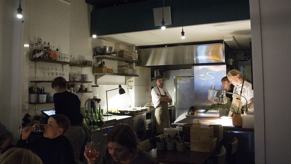 Albertinkadun tila on pieni ja asiakaspaikkoja on tuskin kolmeakymmentä. Keittiö on enemmän kuin avomalli, pari pöytää syö melkeinpä keittiössä. Kokkeja mahtuu työskentelemään pienessä köökissä viisi. Valaistus on ravintolakeittiöksi hämmästyttävän tunnelmallinen. Koska kokit työskentelevät tavallaan salissa, on työtapakin omiin silmiin uniikki. Homma hoituu rennosti, mutta varmasti. En ikinä kuvittelisi siellä kokattavan tähtitason ruokaa.