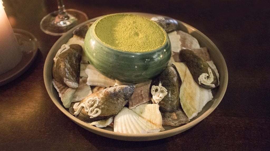 SIMPUKKARUUKKU pöytään. Kuoressaan grillattua sinisimpukkaa Gotlannista, jonka päällä salsa pikkelöidystä kuusenkerkästä ja ruskistetusta voista, jonka päälle kerros ruskistetusta voista tehtyä Béarnaise-vaahtoa ja pinnalla jauhettua kuusenkerkkää. Makujen voima jatkuu. Sinisimpukan syvä pyöreys kohtaa salsan ja vaahdon hapot kuusenkerkän antaessa annokseen metsäistä sävyä. Samettisen ihanaa ja jälleen rohkeutta, joka ei pyytele voimankäyttöään anteeksi, koska ei tarvitse.