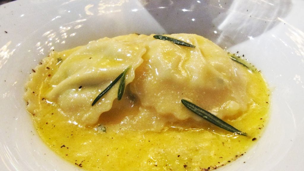 Tilaan alkuun ravioleja täytettynä Robiola-juustolla ja perunalla rosmariinilla maustetun voikastikkeen kera. Näen jo pintapuolisesti, että annos on aitoa Italiaa. Pasta ui voissa ja vähempikin olisi riittänyt, mutta se on saapasmaassa yleistä. Pastan kypsyys on täydellinen ja maku täyteläinen olematta tunkkainen. Rasvapommi, jota voisi hotkia turhan paljon, jos saisi mahdollisuuden. Vaimo testaa keittiön klassikolla. Spaghetti aglio olio e peperoncino eli valkosipuli-oliiviöljy-chili -pasta. Kestää vertailun Italian paikkoihin. Voi, kunpa Tampereeltakin saisi tällaista pastaa!