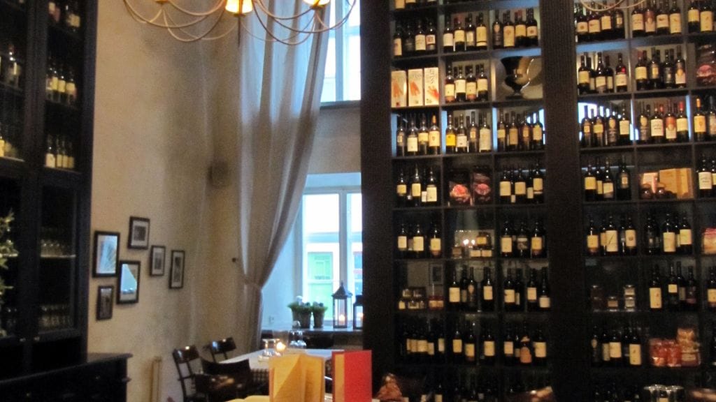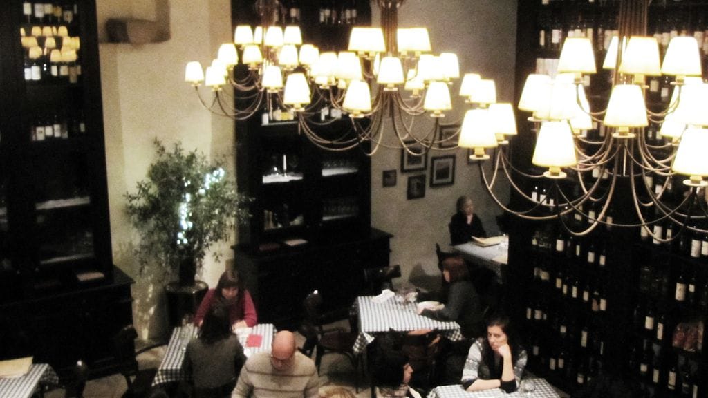 Saavuimme La Bottegaan klo 14. Paikka oli tyhjä. Hämmentävää. Meidät otti vastaan varsin itsetietoisen oloinen, mutta äärimmäisen kohtelias miekkonen. Sali on korkea ja jylhän oloinen. Viinihyllyt ulottuvat metrien korkeuteen, kattoon saakka. Tamminen portaikko antaa vahvaa luonnetta tilaan. Taustalla soi hivenen turhan alleviivatut italoklassikot. Ehdimme juuri tilata, kun paikalle alkaa ilmaantua suomalaisia pöytä kerrallaan. Tunnin päästä paikka on täynnä. Klo 15, turisteille luonteva lounasaika päiväramppauksen jälkeen.