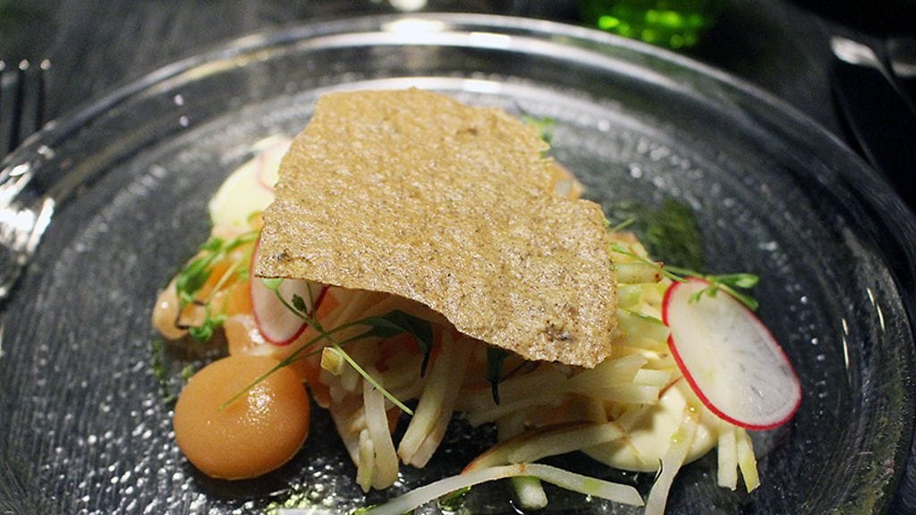 Ruoaksi viiden lajin maistelumenu (52 eur) ja suositusviinit (38 eur). Vaimo haluaa lihattomana. Aluksi molemmille lohitartar, kampasimpukkakreemiä, talviomenaa ja saksanpähkinäkeksiä. Annos on peitetty keksikannella, trendijutulla, jota en ole ymmärtänyt. Tasapainoinen annos, joka raaka-aineiden puolesta lupasi hitusen enemmän, mutta oli lempeän mukava, hillitty. Moselilainen Richard Böckingin mausteinen Sturmnacht Riesling 2014 komppasi erinomaisesti.