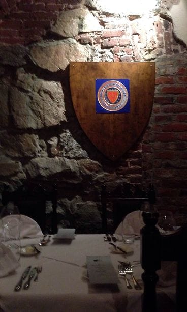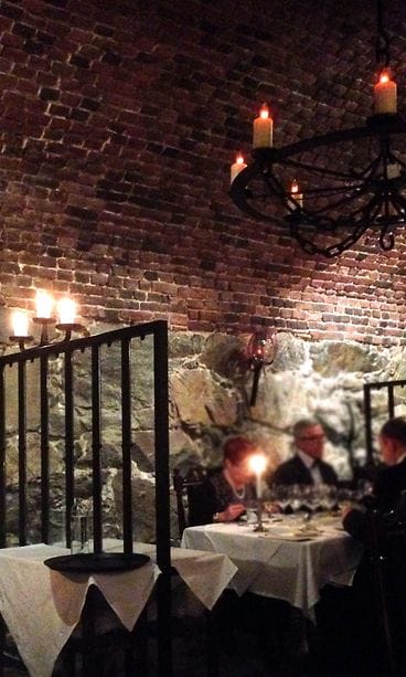 Uudenvuoden aattoiltana ravintola on hitusen yli puolillaan. Asiakaskunta on hyvin moninaista pari-kolmikymppisestä seurueesta kuusikymppisiin pariskuntiin. Miljöönä on jykevä holvikellari, jonne Rotissööri-plakaati sopii jo ihan sisustuksenkin puolesta. Tunnelma on fiksu, mutta ei hienosteleva. Vaimo ilahtui, ettei puhelin löytänyt lainkaan kenttää. En päässyt postaamaan herkkuhetkeä edes vessasta. :)