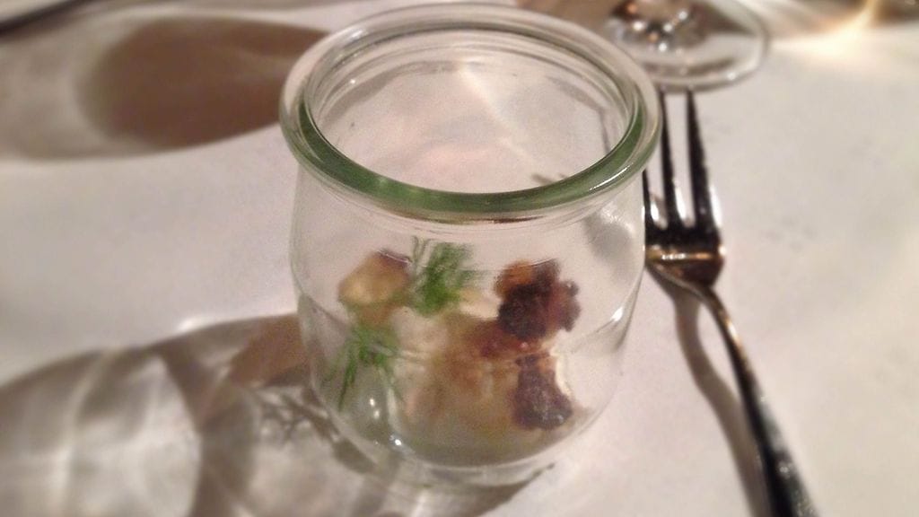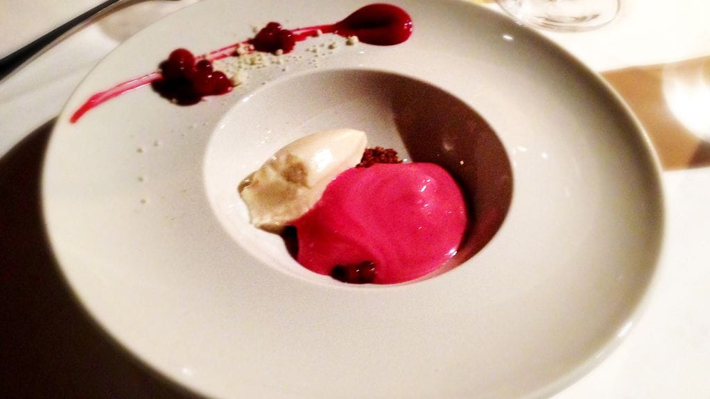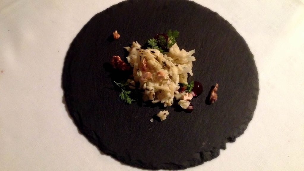 Tarjolla oli pelkästään uudenvuoden menu, joka oli pitkälti koottu ruokalistan annoksista. Tilaamme viiden ruokalajin version (67 eur), mutta kolmella suositusviinillä (32 eur).