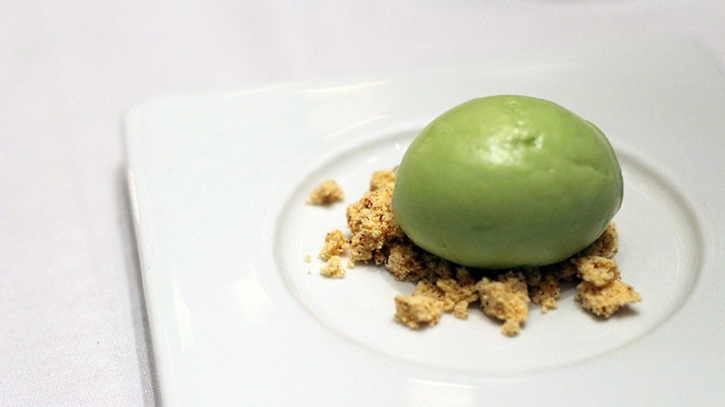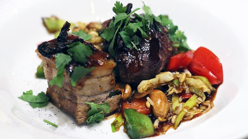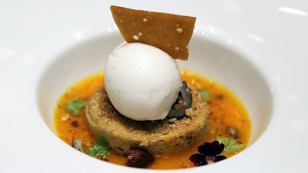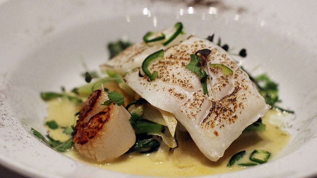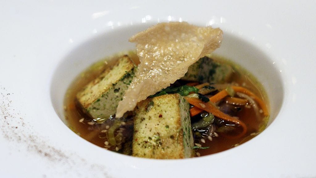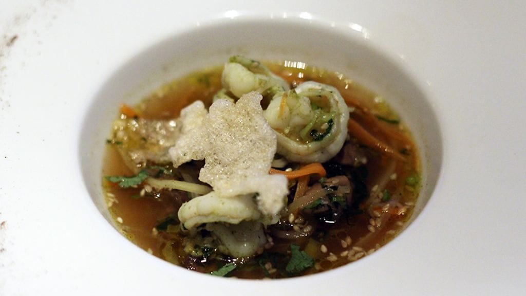 Alkuun ennestäänkin hyväksi havaitut, tyrnimarjoilla vauhditetut Neula-drinksut. Neljän ruokalajin menun (46 €) alkuruoaksi keittoa, jonka proteiinivaihtoehtoina tiikeriravut tai tofu. Vaimo valitsi omaansa ravut ja itselleni jäi tofu, koska maistamismäärä täytyy aina maksimoida. Mausteinen ja monisävytteinen liemi osoittautuu erinomaiseksi. Ehkäpä koko illallisen paras komponentti (ruoan suhteen). Kasvikset sointuvat kokonaisuuteen hyvin, mutta lusikalla syötäviksi ohuet soirot ovat hitusen turhan pitkiä. Tofu ilmenee rapua paremmaksi höysteeksi, vaikka yleensä sangen tylsä kimpale onkin. Hiukan rapsakka ja mausteinen pinta ja mehevä sisus toivat parhaat puolet esiin. Ruokajuomana 13 rypälelajikkeen Domaine Marcel Deiss Alsace Blanc 2014 pistää hyvin hanttiin hivenen voimakkaille mauille tuoden vastapariksi trooppisia hedelmiä ja karvautta.