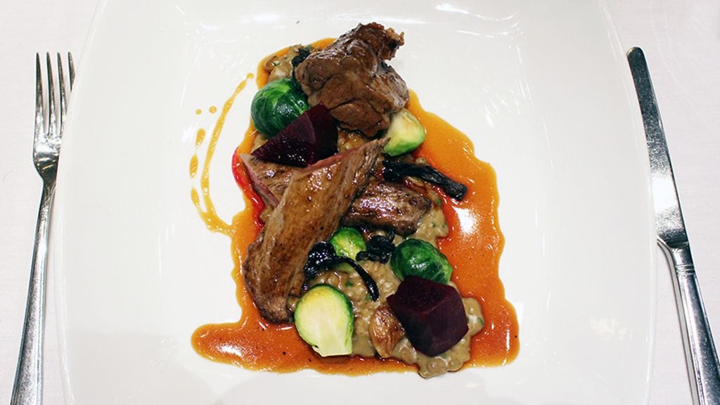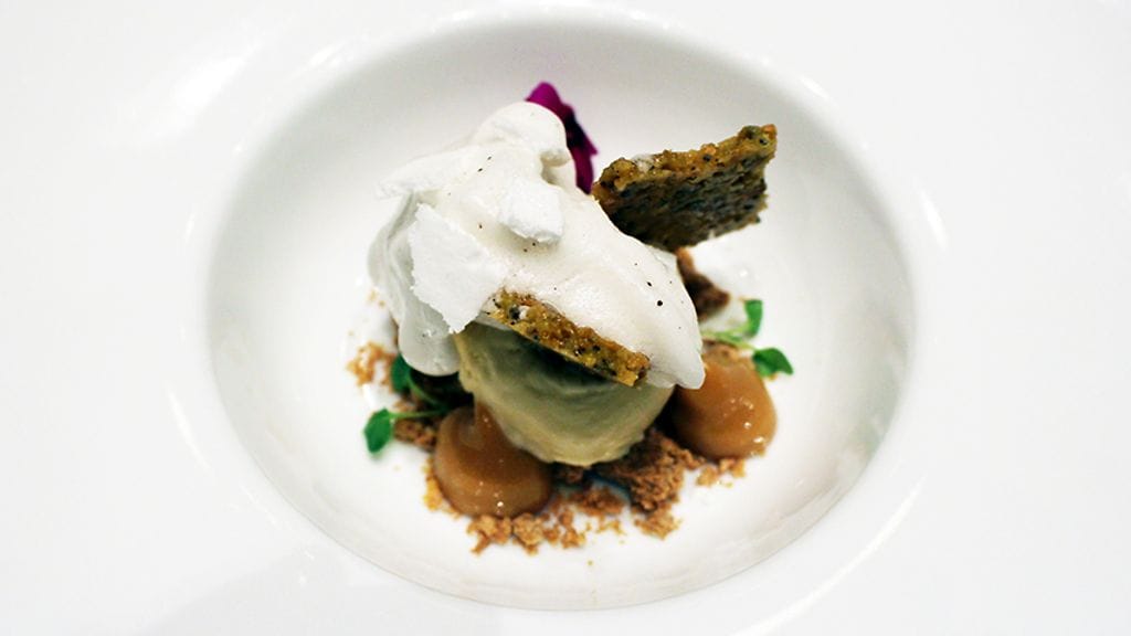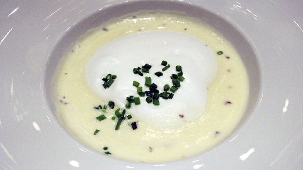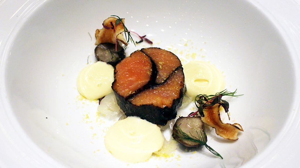 Menun viineistä kaksi onkin jo entuudestaan minulle tuttuja. Pääruoan kanssa tarjottava Casisano Brunello di Montalcino 2011 herättää makunystyröitä pelkällä nimellään. Alkuun kuitenkin kuohuvaa. Perla Apassionato Brut on kuiva ja raikas skumppa, jossa vivahteita antaa vihreä omena ja sitrus. Ei mene suosikkeihini, mutta jäi mielenkiintoisena mieleen. Keittiöstä tuodaan sen kanssa nautittavaksi tyylikkään samettista korvasienikeittoa.