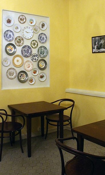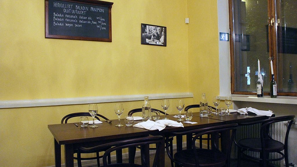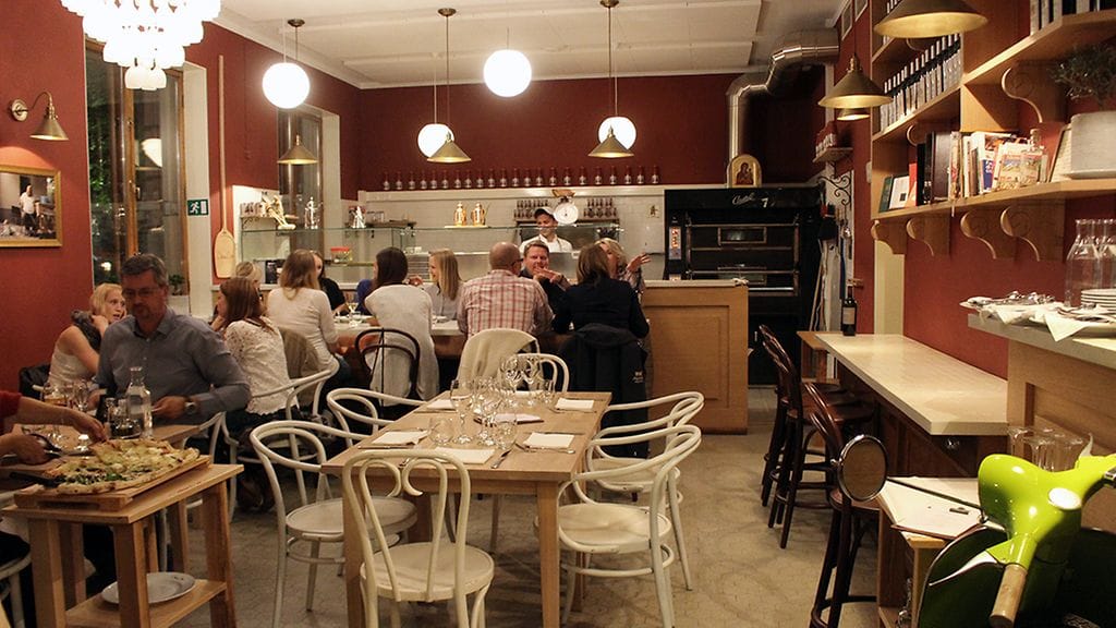 Lauantai-illalla paikka alkaa olla täynnä. Sali on tyylikkäämpi kuin olin varautunut. Oikein viihtyisä ja hienompi kuin useimmat osteriat Italiassa oman kokemukseni pohjalta. Salin perällä leivotaan avokeittiössä pizzat ja muu safka varsinaisessa keittiössä. Meidät ohjataan sivuhuoneeseen, jonka keltaiset seinät tuovat Italia-muistot mieleen. Mikä ihme keltaisessa italialaisia viehättääkään seinävärinä?