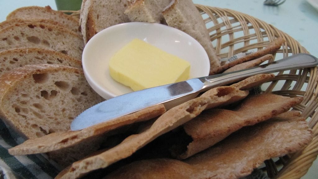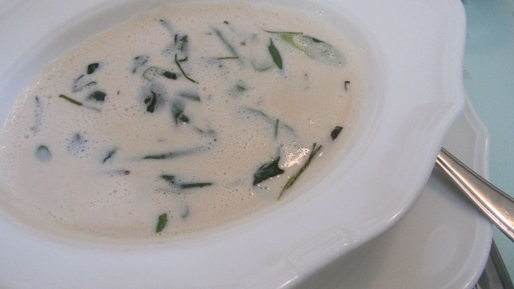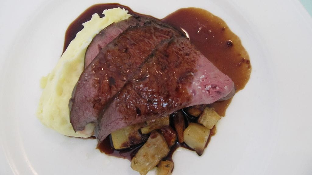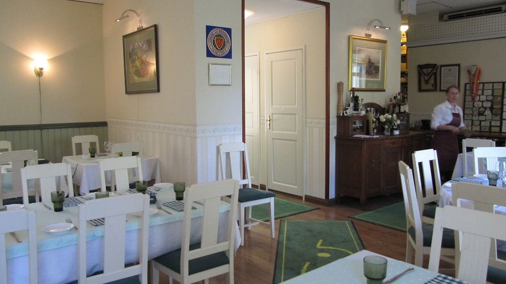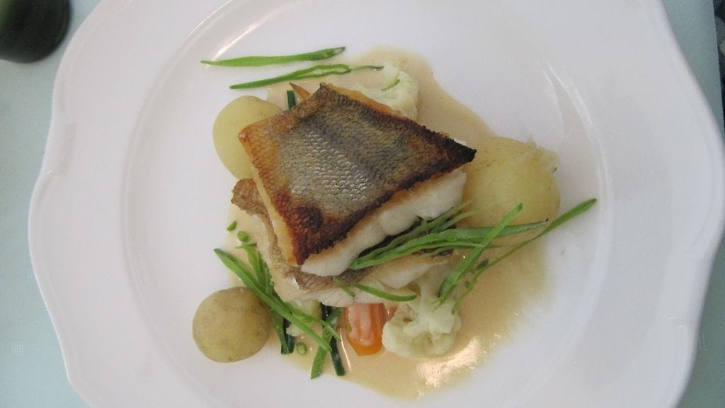 Lounasmenu vaihtuu päivittäin. Annokset sisältävät monipuolisen leipävalikoiman omasta leipomosta, alkukeiton tai salaatin, pääruoan ja kahvin (myös espresson). Varsin edullista, kun lounaat alkavat lounassetelitasosta. Alkuun eteemme tuodaan maittava purjolla vauhditettu katkarapukeitto. Aniharvoin lounaan alkukeitto voisi toimia myös listalla. Nyt voisi. Pääruoaksi valitsemme päivän kalana olevaa kuhaa (19,00) sekä savustettua härkää puolukka-chutneylla (15,50). Kuha ei ole varsinaisesti huono, mutta ripauksen ylikypsää, vetelää ja jossain määrin suolatonta kylläkin. Naudanlapaa on savustettu varsin voimakkaasti. Itselle se toimi etenkin makukokemuksena, mutta monella vahva maku varmasti tökkii. Niin kävi myös vieruspöydässä. Liha on mureaa, mutta jotkut sattumapalat vaativat hivenen purutaitoa. Puolukka antaa sopivaa pehmennystä. Annos huutaa seurakseen makua taittavaa viiniä, mutta autoilijan roolissa jätin sen pois. Olisi pitänyt edes puolilasillista ottaa kokonaisuutta tasoittamaan. Mielenkiintoinen annos, jonka muistaa ihan hyvällä, mutta jota en uudelleen tilaisi. Jälkkäriksi otamme puoliksi ternimaitobryleen. Kuori on sopivan rapsakka, mutta turhan ohut. Maku on sinänsä kunnossa ja puoliksi syötynä juuri sopiva ei-niin-makeanpersoille ruokailijoille.