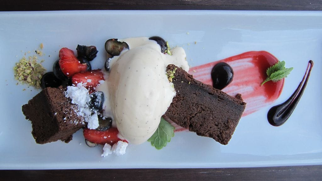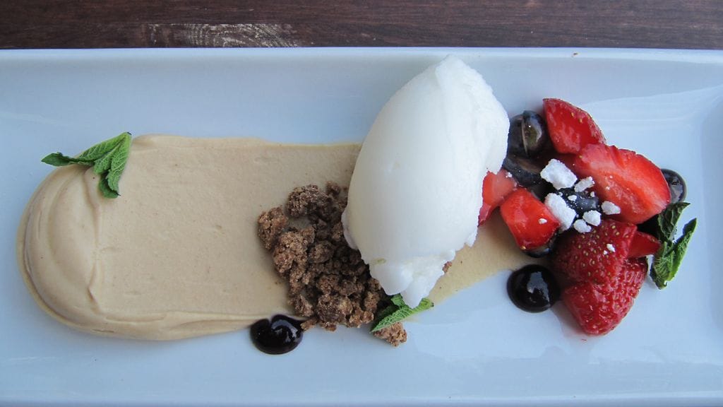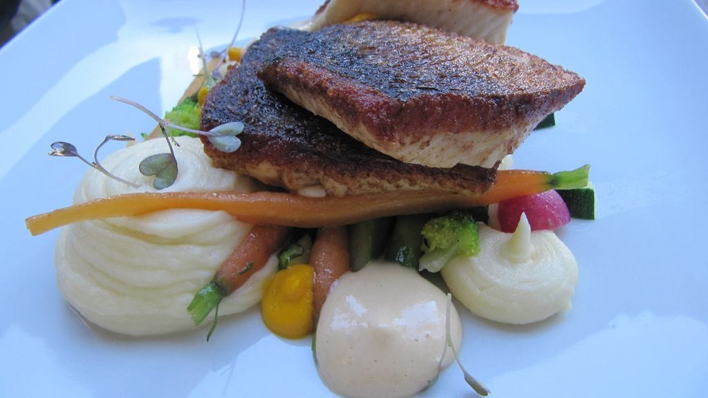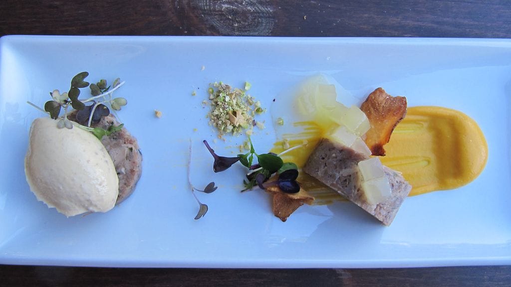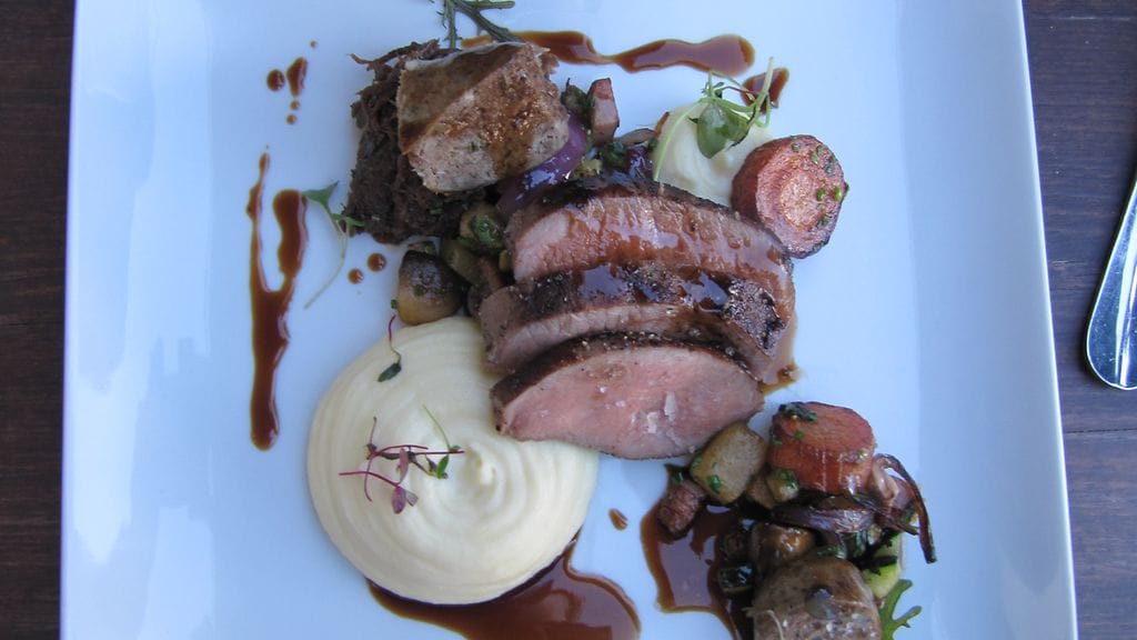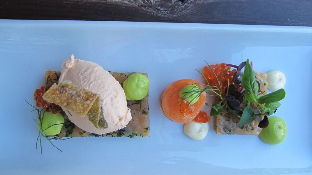Huvilan tarjonta on tullut tutuksi Alkossa ja marketeissa olevien oluiden ja siiderien myötä. Ravintolassa tarjoiltavia panimotuotteita ei sen sijaan muualta löydä. Niinpä päätän nauttia ruokajuomaksi oluita. Otamme alkuruoiksi nieriää kolmella tapaa sekä ankkaa kahdella. Annosten kauniit ulkonäöt veivät raflaa fiinimmäksi, mitä olin odottanut. Tarjoilija ei liiemmin annoksia esitellyt eikä muutenkaan turhia pokkuroinut, mutta hoiti hommansa mallikkaasti laittamalla persoonansa peliin. Tämän perään olen aiemmissa arvosteluissa huudellut. Terassi, live-suomirokki, omat panimotuotteet ja fine diningia hipova ruoka ovat erikoinen yhdistelmä, jossa tarjoilulle antaa mielellään vapauksia. Kalaa on tarjolla 35 asteessa kypsennettynä, savumoussena sekä tartarina. Varsin mallikas aloitus. Ei fanfaareja, mutta ei moitteitakaan. Ankan ylikypsä koipi oli onnistunut annos ja maksamoussen kanssa oli pysytty lestissä. Itse en pidä sen usein liian makeaksi tehdystä sävystä.