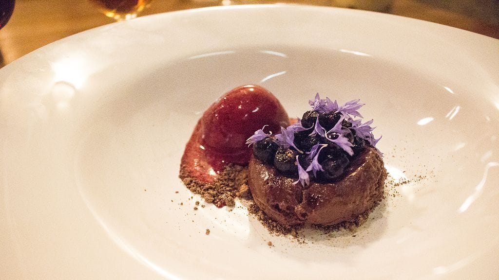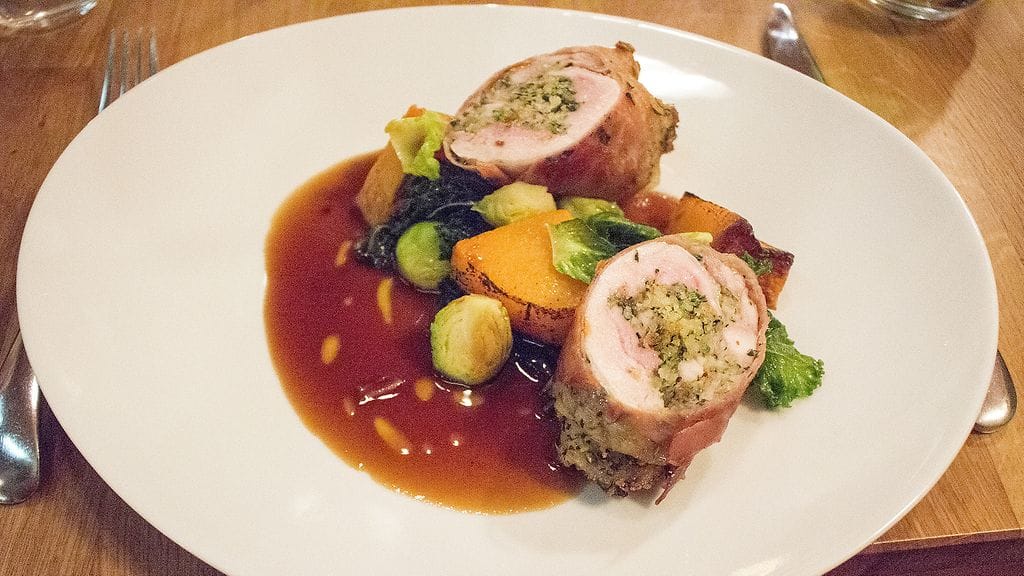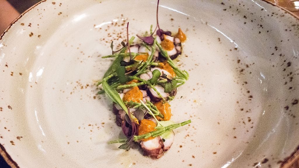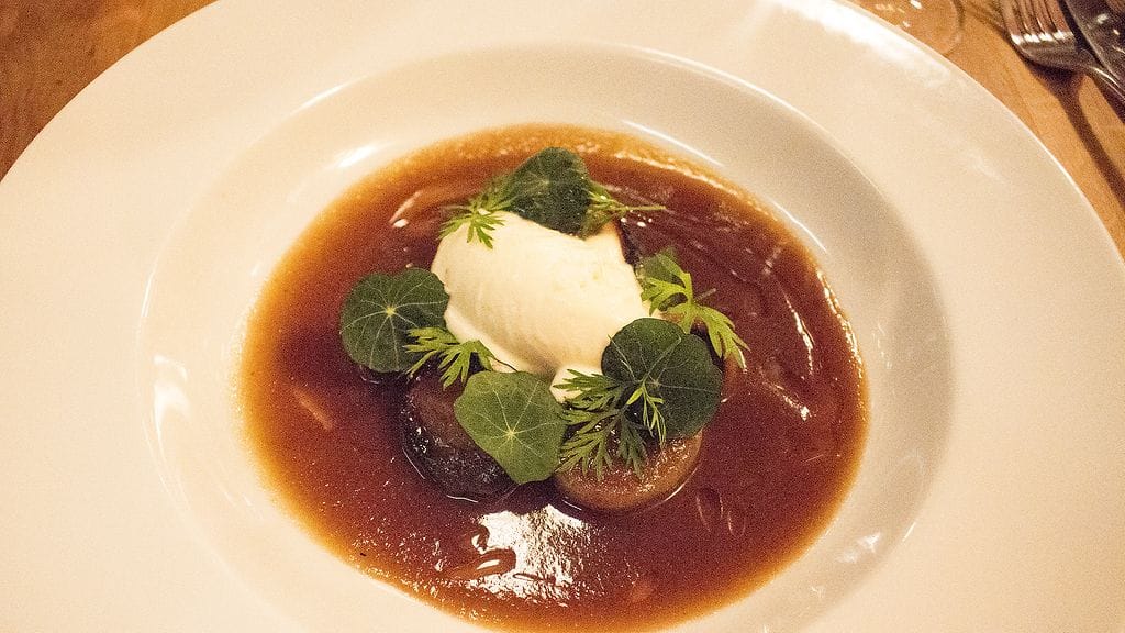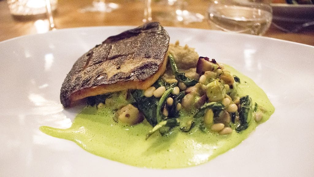 ALKUUN. Alkuruoiksi kaksi hyvin eri tyyppistä annosta, jotka jaoimme vaimon kanssa puoliksi. Mustekala-carpaccion (10,50) kanssa tarjoiltiin paahdetusta paprikasta tehtyä kastiketta ja meriparsaa. Raikas setti, joka lokakuuhun aseteltuna maistuisi parhaalta upean kauniina syyspäivänä. Keittiömestari Niko Ervalahti pahoittelee hitusen turhan paksuksi jääneitä siivuja, jotka ovat juurikin turhan paksuja, mutta eivät lainkaan mahdottomia. Yksinkertainen ja kaunis annos toimi, mutta jätti vielä hiukan varauksellisuutta seuraaviin ruokiin. Marchelainen Colle Stefano Verdicchio di Matelica sen sijaan komppasi mustekalan kanssa loistavasti. Yllättävän hedelmäinen Verdicchio, vaikka toki mineraalinen ja sitruksinen rapsakkuus viiniä kantaakin.