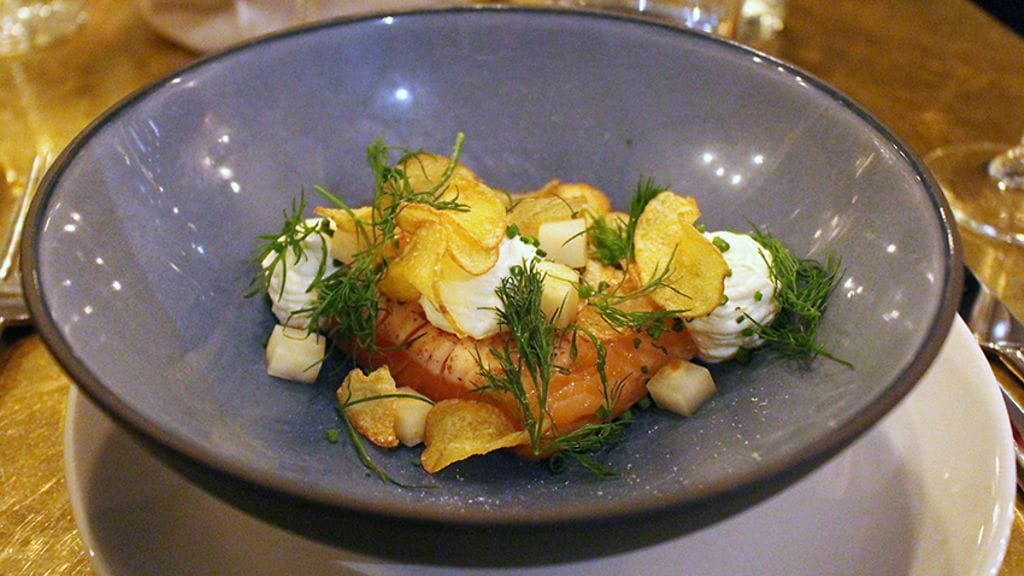 Otamme alkuun ”Fish ’n’ Crispsin - hitusen paahdettua lohta, piparjuuri-cremeä ja pikkelöityä selleriä (14 eur). Herkullisen raikas annos, jonka piparjuuri nosti nextille levelille. Hippunen suolaa ei olisi ollut pahitteeksi, mutta sirottimen pyytäminen olisi ollut isompi haitta.