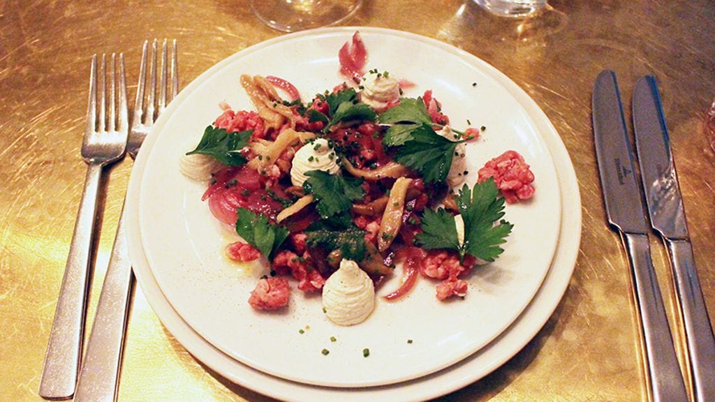Toiseksi (tietenkin) tartaria. Rangers Valley eli tartaria, unagi-kastiketta ja marinoituja osterivinokkaita (19 eur). Liha suli suuhun. Kastiketta oli turhan paljon ja pienehkö ripaus suolaa ei olisi ollut pahitteeksi, mutta oikein haarukoituna, erinomainen tartar. Molemmille annoksille suositeltu Samuel Billaud Chablis 2014 toimii lempeän raikkautensa ja ryhdikkyytensä ansiosta.