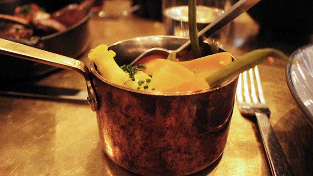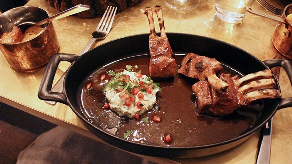 Toiseksi pääruoaksi mausteiset lampaankyljykset harissalla, tuorejuustolla ja granaattiomenan siemenillä (27 eur). Alkuun pöytään tuodaan teatraalisesti puuhun isketty puukko. Näitä on nähty, mutta silti vielä toimii. Näin annoksessa monta miinaa eikä yhteenkään astuttu. Päinvastoin. Liha oli parasta syömääni karitsaa. Hyvin punaista, hyvin mehevää, hyvin suussa sulavaa. Annos oli pöytään tullessa lämmöltään sitä, mitä haluaisin loppupalasen olevan, mutta laadukas liha ei töki suussa hiukan haaleanakaan. Tarjoilija ei kertonut lihan alkuperää esipuheissaan ja kertoi kysyttyäni sen olevan Ahvenanmaalta. Vetisen mauttoman uusseelantilaisen olisin maistanut. Harissa viipyili suussa hitusen, joten tuorejuusto granaattiomenan siemenillä nappasivat mallikkaasti vetovastuun vahvan lihan komppaamisesta. Juomaksi hyvin yhteen svengaava, Olivier Lemasson Les Vins Contes Gama Sutra. Marjaisen syvä, mutta silti raikas omalla twistillään.