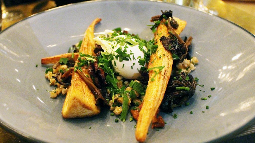 Pääruoaksi annos palsternakasta, täydellisestä uppomunasta, timjamilla ja rosmariinilla maustetusta tuorejuustosta, grillatuista sienistä ja rukiista (21 eur). Juurevuutta, täydellistä kypsyyttä ja uppomunan lempeää valuvuutta. Tässä kohdin olisi toivonut, että olisi pyytänyt jo aiemmin suolamyllyä pöytään. Riittävän hyvin toimi ilman myllyn huitomistakin. Lasiin Bénédicte et Stéphane Tissot Les Graviers 2014. Yllättävän helppo, mutta hyvällä tavalla. Runsas ja pyöreä. Sopivasti mausteinen.