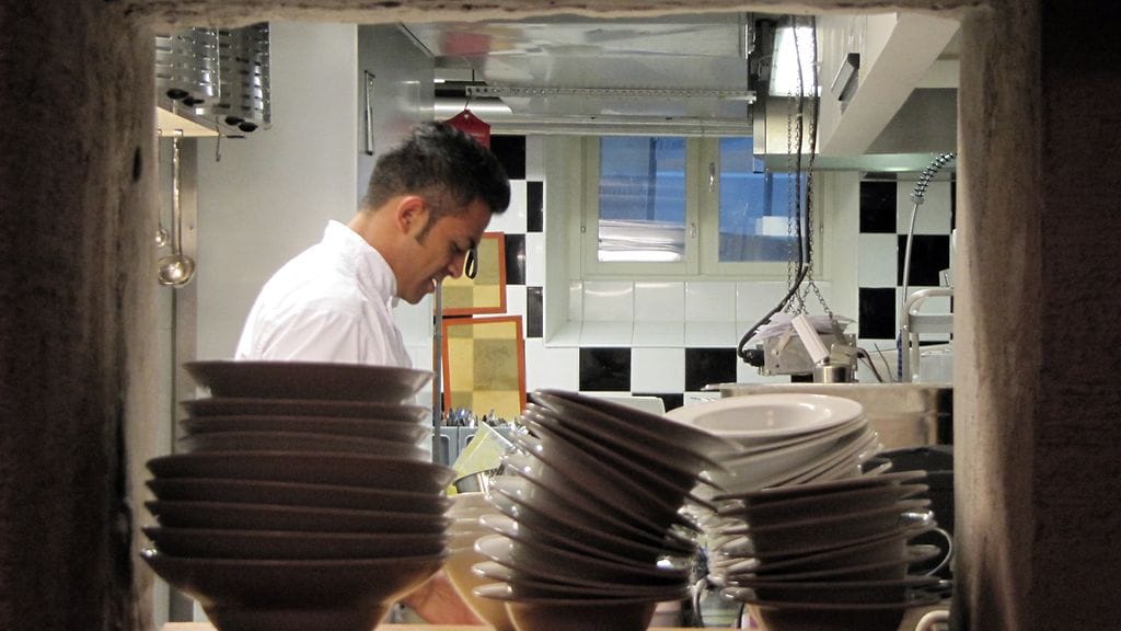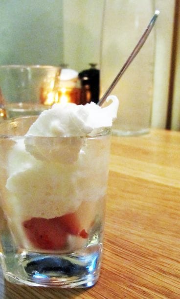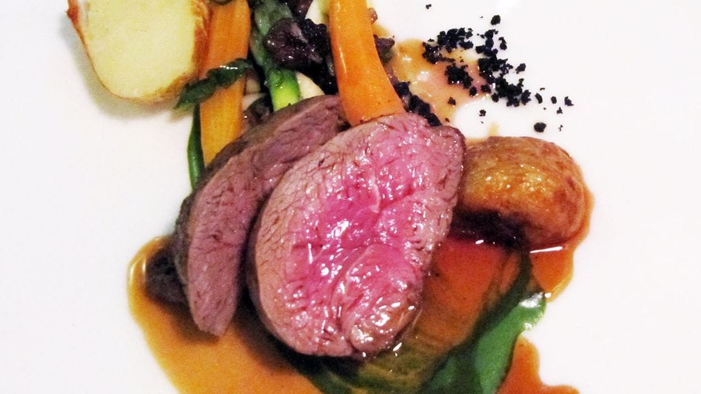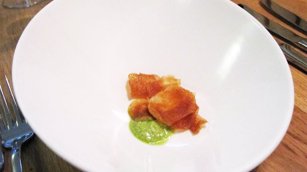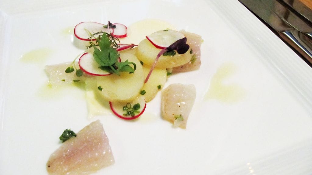 Tilaamme yllätysmenut (55 eur), mutta emme huomaa ottaa niitä eri painotuksin erilaisten annosten määrän maksimoimiseksi. Menun teemana on festarien myötä neitsytperuna. Alkuun meitä tervehditään keittiöstä neitsytperunachipseillä. Ei kai sipsit paljoa paremmaksi voi tulla. Seuraavaksi eteen tuodaan shottilasillinen tryffelillä maustettua perunakeittoa. Tryffelin käyttö on taitolaji ja tässä kokki on pysynyt mainiosti lestissään. Alkuruoaksi saamme graavattua kuhaa, neitsytperunaa, retiisiä, raparperia ja pyreetä (jonka raaka-ainetta en muista). Annoksen maut ovat hyvin puhtaita, etten sanoisi jopa tylsiä. Sitten yhteen suupalaan osuu raparperia ja makunystyrät heräävät. Tästä tässä annoksessa olikin kyse! Sen enempää loistavaa makua ei annoksesta löydy, koska ainoa raparperin palanen meni siinä. Sääli.
