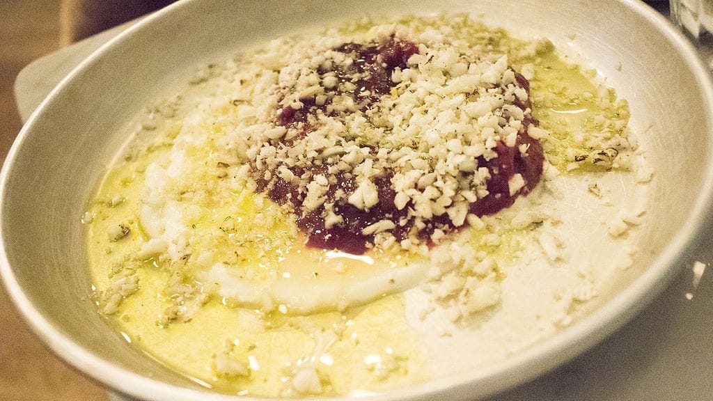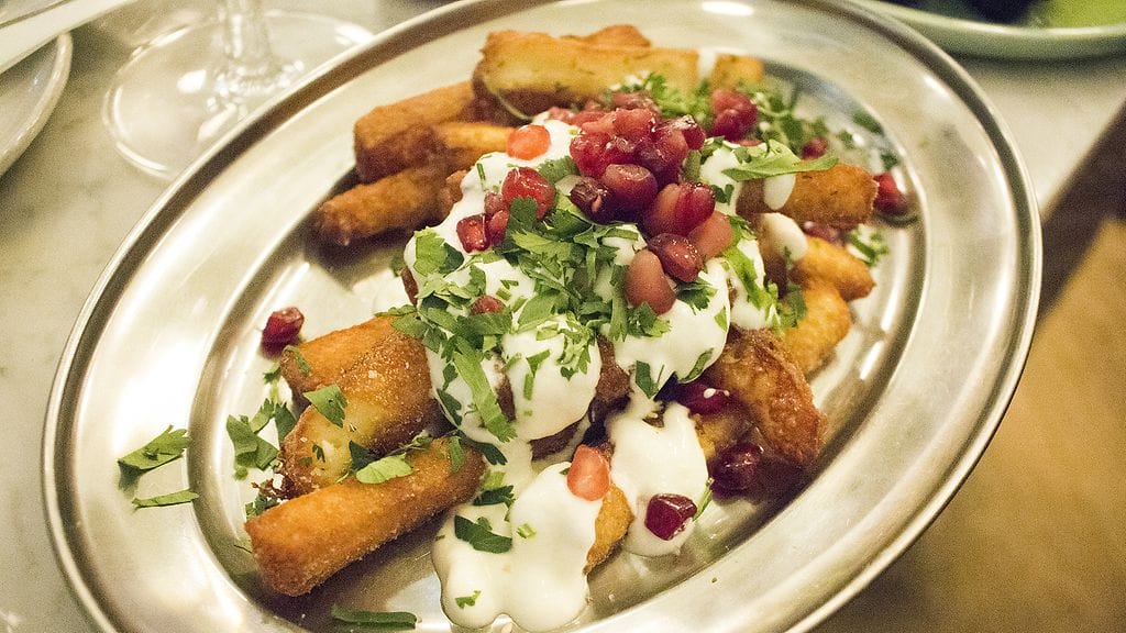 Pöytään aluksi kolme annosta (10-12 eur/kpl). Aloitetaan vaimon kertoman mukaan suurta some-suosiota niittävistä halloumiranskalaisista. Sinänsä simppeli, paneroiduista ja uppopaistetuista halloumitikuista, granaattiomenan siemenistä, jogurtista ja korianterista tehty annos on hurmaava. Halloumi näyttää parhaita puoliaan suolaisen mehevänä ja granaattiomenan siementen hapot leikkaavat mainiosti frittiherkun rasvaa. Rakastan halloumia tällaisena ja vihaan sitä sen saadessa jäähtyneenä hitusenkin kumimaista tekstuuria. Kokonaisuus ei tarjoa hienouksia, mutta pirun hyvää makua senkin edestä.