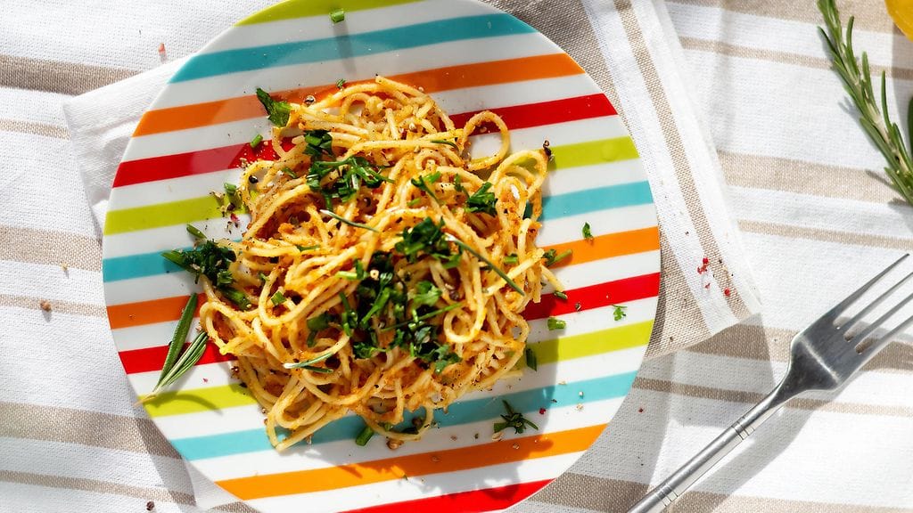 Kypsennä spagetti pakkauksen ohjeen mukaan kiehuvassa vedessä. Valuta ja siirrä sivuun. Sulata tällä välin kaksi ruokalusikallista laakealla pannulla keskilämmöllä. Kun voi alkaa vaahdota, lisää pannulle pankojauhot. Ruskista jauhoja voissa 3–4 minuutin ajan. Siirrä kulhoon.