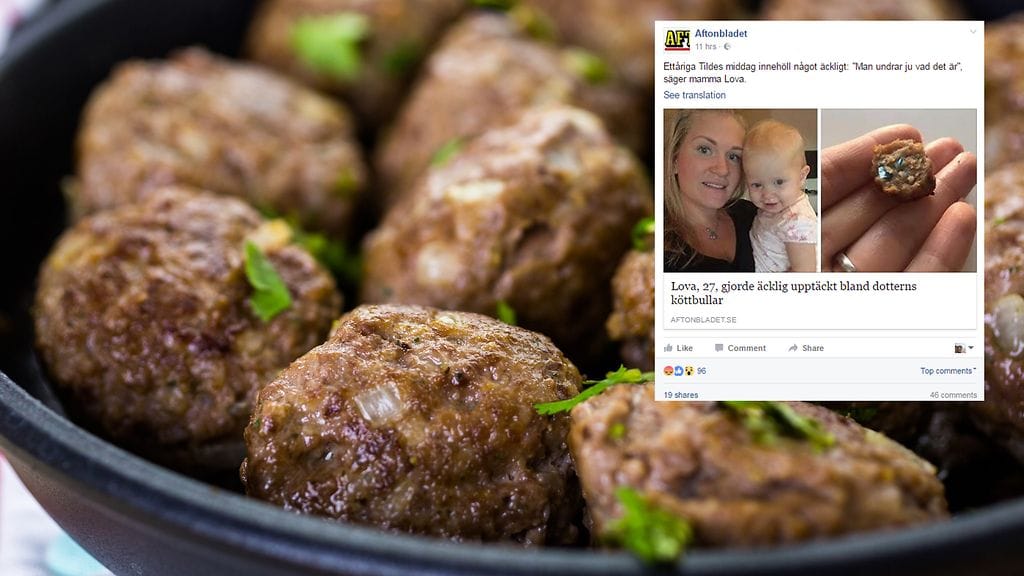 Lova Lundkvistin oli tarkoitus syöttää yksivuotiaalle lapselleen vastikään lihapullia, joiden sisältö ei lopulta ollutkaan sitä, mitä olisi voinut odottaa. Yksi lihapullista sisälsi pieniä, sinisiä muovinpalasia. Lundkvist huomasi lihapullassa jotain outoa, kun hän halkaisi sen lapselleen kahtia.