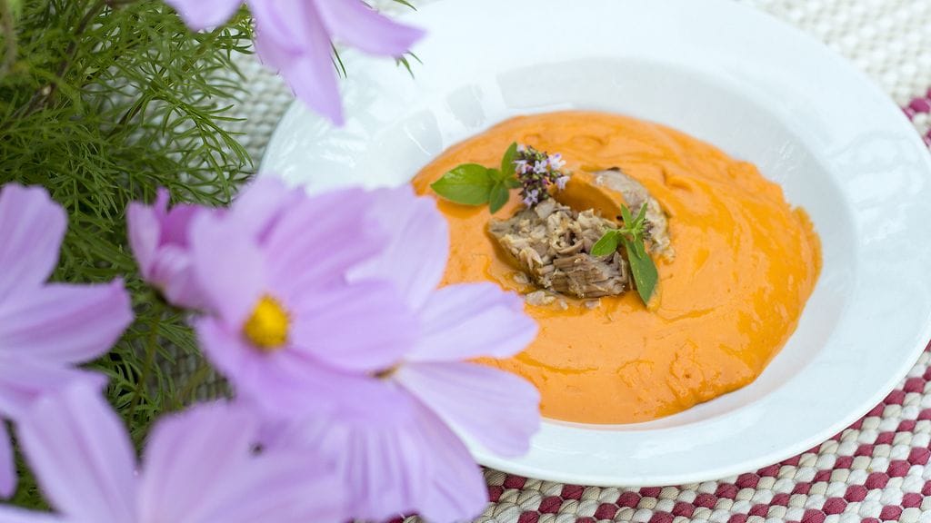 Kuohkean runsas, kermainen koostumus saadaan aikaan leivällä, mantelilla ja oliiviöljyemulsiolla. Sain Buzzador-palvelusta käyttööni Boschin VitaBoost-blenderin, joka teki keitosta hetkessä samettisen pehmeää. Ruokaisa keitto kruunataan perinteisesti ilmakuivatulla serrano-kinkulla ja keitetyllä kananmunalla, mutta ihastuin Lambuzo-ravintolan tapaan tarjoilla salmorejoa tonnikalapalalla. Päälle vielä loraus hyvää oliiviöljyä ja täydellinen hellepäivän keitto on valmis. Nauti alkuruokana, lounaana tai tapasten kera.