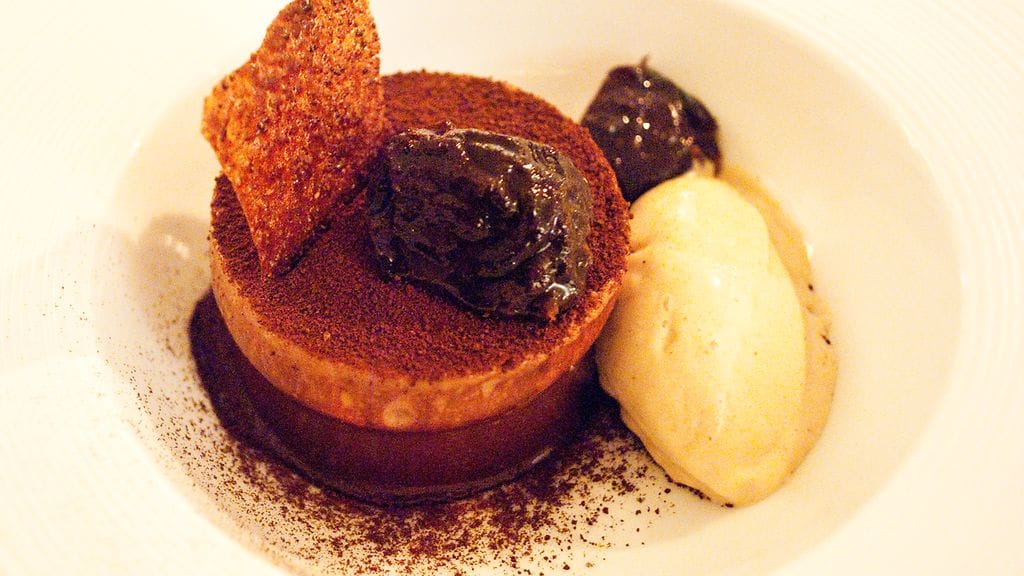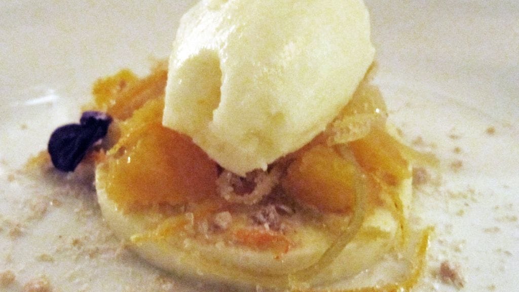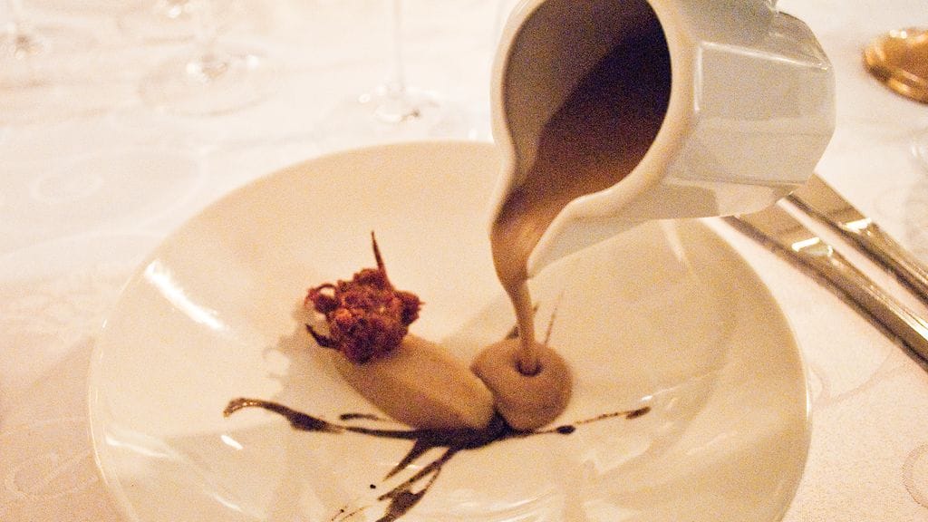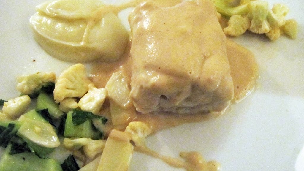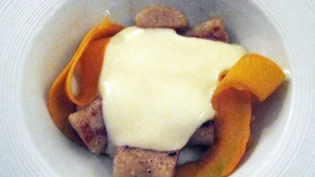 Vaimon eteen tuotiin upean näköinen annos . Mietojen makujen yhdistelmä kunnioitti ominaismakuja, mutta mukaan olisi voinut ottaa jotain pientä twistiä. Rakennetta annos sai pohjalla olleesta keksistä. Väliruoaksi sain . Rapean lihan ja pyreen päälle lorautettiin annos samettista munakoisokeittoa. Hyvin toimiva kokonaisuus. Munakoison mausta oli otettu irti, mitä pystyy. Keiton määrä oli mielestäni hivenen suuri suhteessa muihin ainesosiin. Varsin toimiva silta kala- ja liha-annoksen välissä. Toiselle puolelle pöytää kannettiin . Kurpitsan vauhdittama annos toi sopivan määrän lisää makua alkuruoan jälkeen. Maanläheinen makupala.