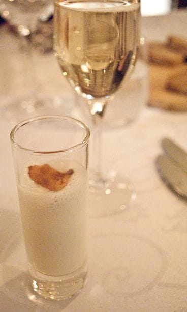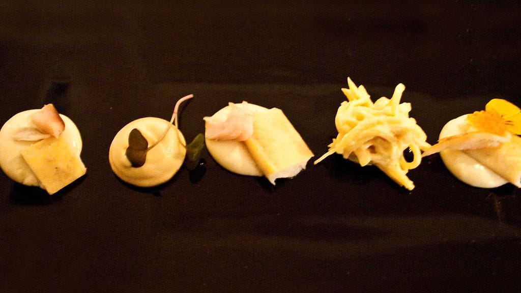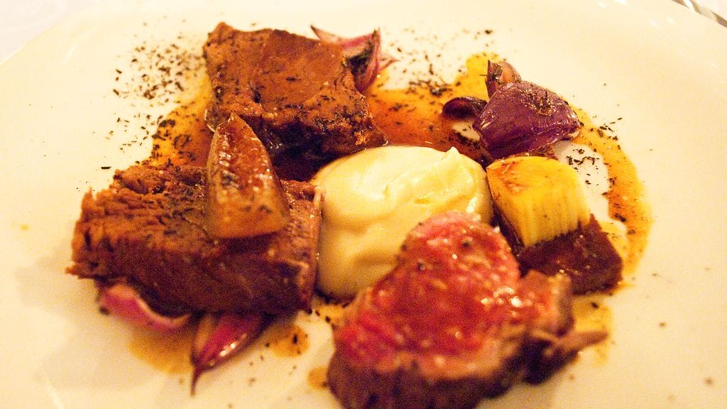 Menuja oli tarjolla kaksi ja otimme luonnollisesti ne molemmat suositusviinipakettien kruunaamana. Alkuun meille tuotiin keittiöntervehdyksenä maa-artisokkaa keiton ja sipsin muodossa. Loistava makunystyröiden avaaja! Juuressipsit ovat suurta herkkuani ja samettisen kuohkea keitto pinnoitti suun ja sai vaatimaan lisää. Alkuruoaksi sain Savukalaa ja selleriä. Lämminsavustetut kalat eivät ole päässeet vielä kalaan siedätyshoidossani mukavuusalueelle asti, mutta kuten laadukkaissa rafloissa olen huomannut, osaa taitava kokki valmistaa jokaisesta raaka-aineesta jotain makurajoitteiden ylittävää. Niin nytkin. Koko menun parhaaksi osaksi ilmentynyt, upea annos tarjoili lepällä savustettua särkeä, omenapuulla ja fenkolinsiemenillä savustettua haukea sekä katajasavussa kypsynyttä lahnaa. Tasapainottajana toimi juuriselleri savupyreenä ja appelsiinisena majoneesisalaattina. Uusia makuja, jotka tekevät oikeutta useiden roskakaloina pitämille onkisaaliille. Muutama tällainen lisää ja makuvinoutumani olisi korjattu!