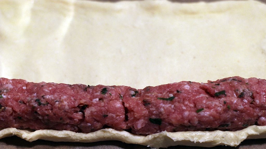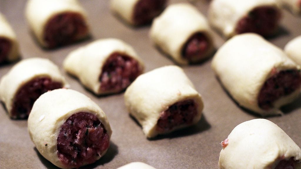 Ruoka on hyvin lähellä lihapiirakkaa, mutta siihen ei tule riisiä. Voitaikinan sisään rullattavaan täytteeseen voit laittaa melkeinpä mitä vain. Voit käyttää myös kaupan raakamakkaraa, kunhan puristat täytteen ensin kuoresta ulos. Lopputulos on lähellä suomalaista (järkyttävää) nakkipiiloa/nakkikätköä/nakkipiirakkaa, joka palauttaa monelle lapsuusmuistot mieleen.