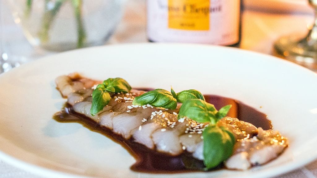 Koska arkiruoka kuluu pitkälti oman kokkailun merkeissä, juhlimme merkkipäivää nouto-susheilla. Siten perjantai-ilta ei painottuisi kokkailuun. Olin saanut näytepullon 200-vuotiasta taivaltaan juhlivasta roseeshampanjasta, Veuve Clicquot Rosé Champagne Brutista, jolle halusin tehdä sushien kylkeen vielä oman spesiaalin makupalan. Raikkaan täyteläinen shampanja toimii ruokapöydässä monipuolisesti keskivahvan makupaletin tasolla. Carpacciota, ankkaa, tonnikalaa ja semmoista. Nyt särvingiksi Tomi Björckin ohjeen mukaan siika-sashimia wasabi-kastikkeella. Erinomainen kombo.