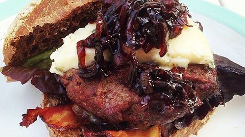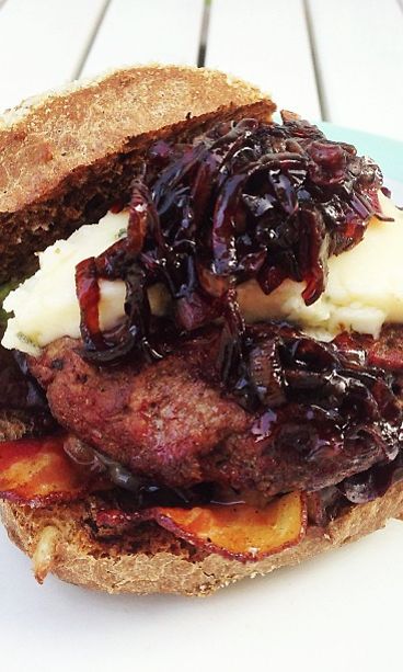 ONNISTUNUT TÄHDERUOKA. Keräsin yhteen kaikkea, mitä kaapista löytyi ja yllättäen sain kokoon yhdistelmän, jonka tiesin olevan hyvä. Se osoittautui kuitenkin erinomaiseksi. Tummanpuhuva burgeri, jossa pääroolia näyttelevät suolainen sinihomejuusto, tummasävyinen, balsamietikassa karamellisoitu punasipuli sekä makean happama kurkkurelissi. Mahtavat makuparit! Kun sekaan laitetaan vielä tähteinä olleet pekoniviipaleet, oli tyylipuhdas, tummasävytteinen burgeri valmis. Olennainen vinkki burgerin työstämiseen on myös se, ettei yritä tunkea sisään kaikkea, mitä kaapista löytyy, vaan yritää löytää toisilleen sopivia makupareja. Esim. tuore tomaatti olisi tässä yhteydessä pilannut makua paljon, vaikka useimmiten loistava lisä burgerissä onkin.