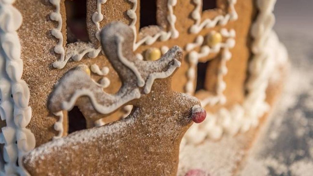 Piparkakkutalo on koristeltu perinteiseen tyyliin.