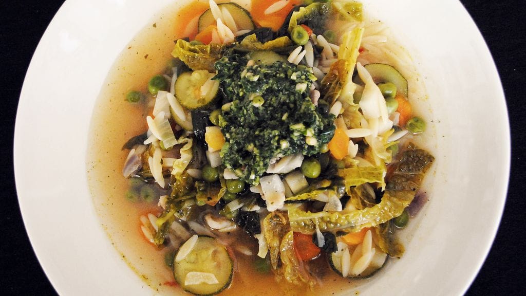 Oheiseen reseptiin käytin jämät juuriselleristä, kurttukaalista, persiljasta, pinaatista, salaatista, sipulista, porkkanoista, tomaatista, riisin muotoisesta pastasta ja kesäkurpitsasta. Lisäksi pakkasesta löytyi pussi herneitä. Ohje toimi mainiosti, mutta niin toimii vähän minkälainen oma sovellus tahansa. Eli suosittelen kurkkaamaan jääkaappiin tai miettimään vihannesosastolla, mistä kaikesta itse voisi tykätä. Voit jättää pekonin pois tai lisätä mukaan lisää lihaa - vaikka tähteitä. Sesongin kunnioittaminen on keiton juju. Toukokuun alussa se on toki hivenen rajallista, mutta pistä ruokalaji korvan taakse kesän satoa varten!