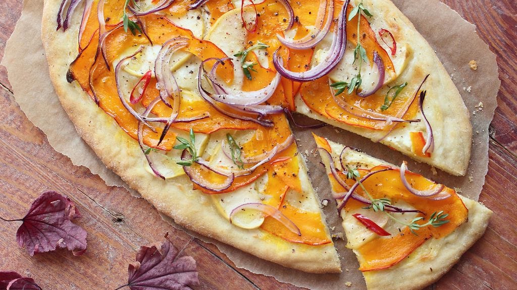 Kurpitsa on yllättävän herkullista pizzan päällä. Kokeile herkun valmistamista vaikkapa tämän reseptin mukaan.
