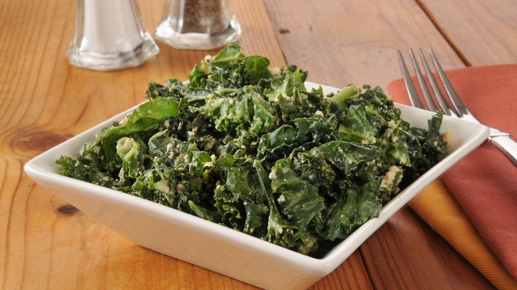 Noin viisi runsasta kourallista vihreää, kuten lehtikaalia, rucolaa ja pinaattia
