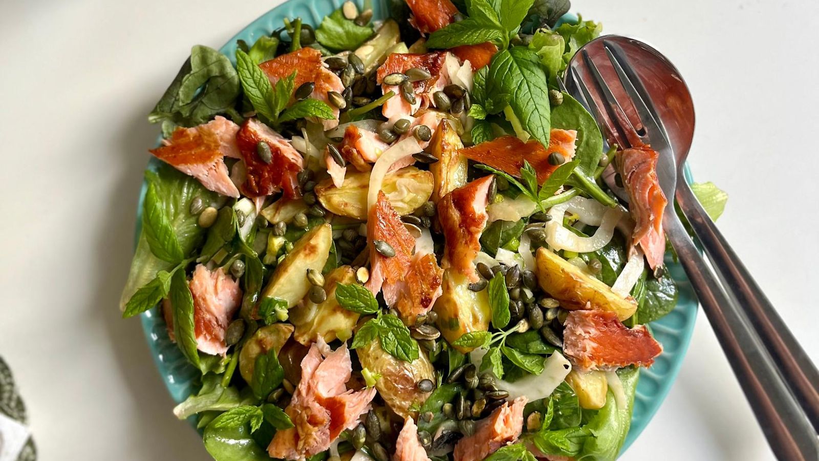 Lämmin peruna-savukalasalaatti sopii keväiseen brunssipöytään. Nappaa resepti talteen ja kokeile kotona!