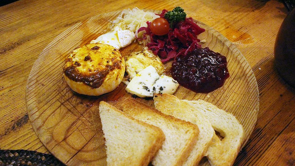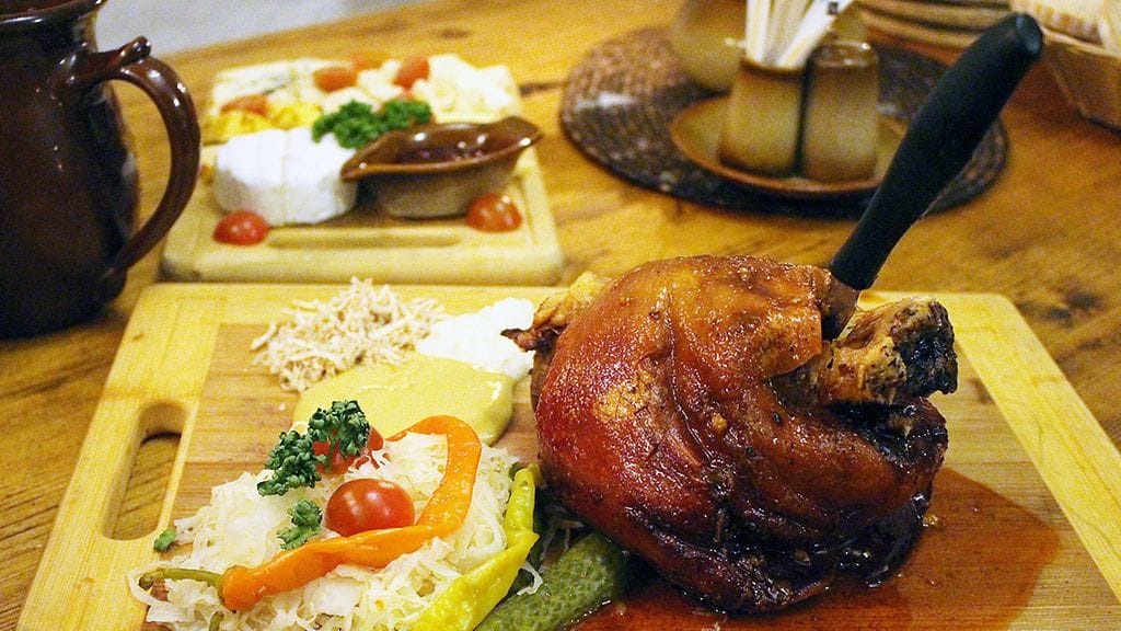 Alkupalana - kyllä, alkupalana - oleva possunpotka on parasta lajissaan. Täydellisen rapea nahka, mehevän rasvainen liha. Huikea! Potkan höysteeksi pöytä on katettu täyteen tsekkiläisiä leikkeleitä ja juustoja, aivan kuten jokaisessa muussakin käymässämme paikassa. Makumaailmasta ei tarvitse hakea nyansseja, Tsekit eivät kitsaile makujen runsaudessa. Rouhean rustiikkista. Ja niin, tässä vaiheessa tyhjeni jo toinen kolpakko Budvaria, toinen niistä mixinä tummasta ja vaaleasta lagerista. Oikein mainio.