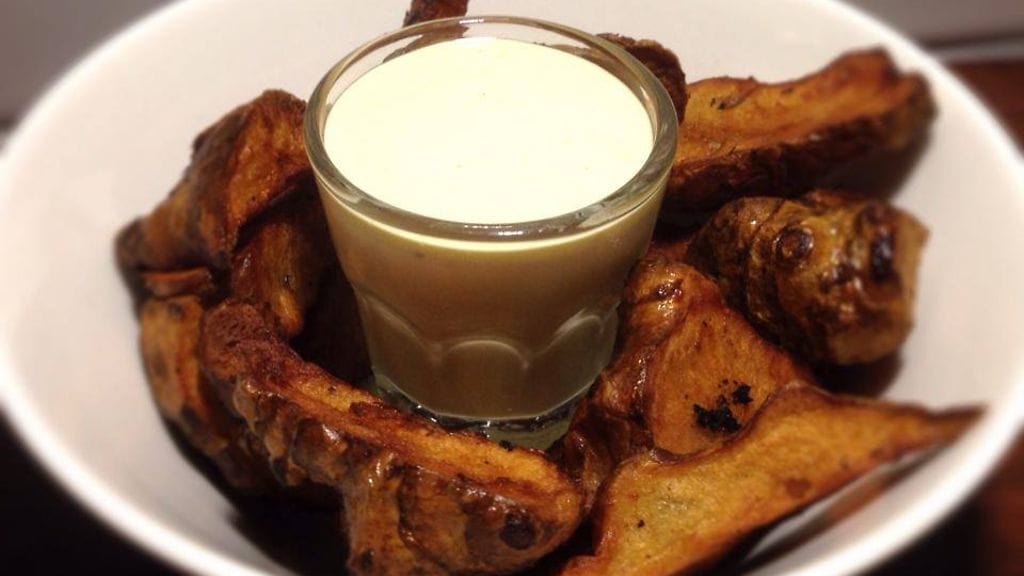 Friteeratut maa-artisokat sitruunaisella dipillä