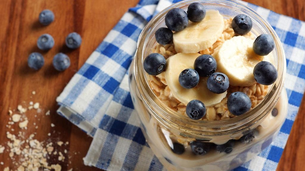 2. Sekoita ainesosat purkissa aamulla, koristele annos tuoreilla mustikoilla, vadelmilla tai vaikka banaanilla ja nauti!