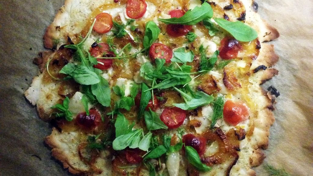 Suolaisen ja makean liitto on yksi ruokamaailman parhaita. Löysin erinomaisen sellaisen edustajan huhtikuun Glorian ruokaviini -lehdestä. Välimerellinen fenkolipiiras on paljon pizzan oloinen, mutta raikkaampi, kevyempi ja vieläpä gluteeniton. Pohja onnistuu varmasti tavallisena pizzapohjanakin, mutta ohjeen mukaisesti gluteenittomista jauhoista tehtynä se osui kerralla maaliin.