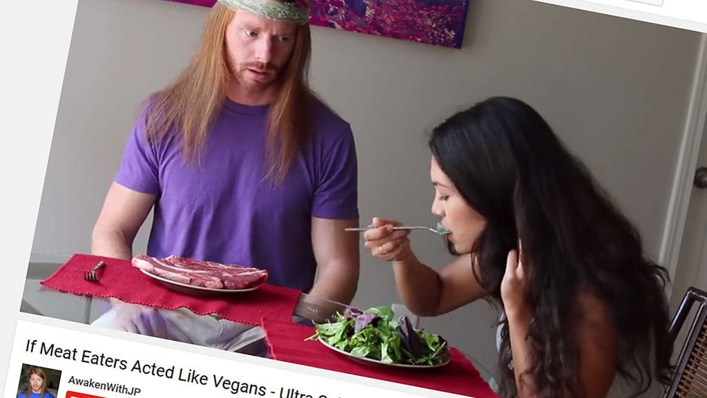 Hulvattomassa YouTuben Ultra Spiritual Life -sarjan jaksossa JP Sears näyttelee hupaisissa kohtauksissa. Tällaisiako lihansyöjät olisivat, jos he käyttäytyivät vegaanien tavoin?