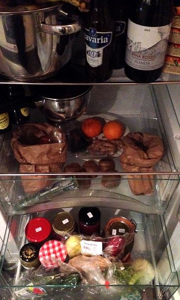 Minulle tuli viikonloppuna mieleen blogata oman jääkaappini sisällöstä. Hetken täytyy olla yllätys itsellenikin eikä jääkaapin sisältö saa olennaisesti poiketa normaalista. Tänään päätin tehdä sen. Päätin ja tein listauksen välittömästi, lainkaan ennakkovarautumatta. Kaikki, mitä kaapissa näet, ovat paikallaan. Joitakin etikettejä käänsin esiin. Mitään en salannut, mitään en lisännyt. Kaappi on varsin täynnä tavaraa, mikä tähän aikaan viikosta on tavallista. Sunnuntai-iltana tyhjempää.