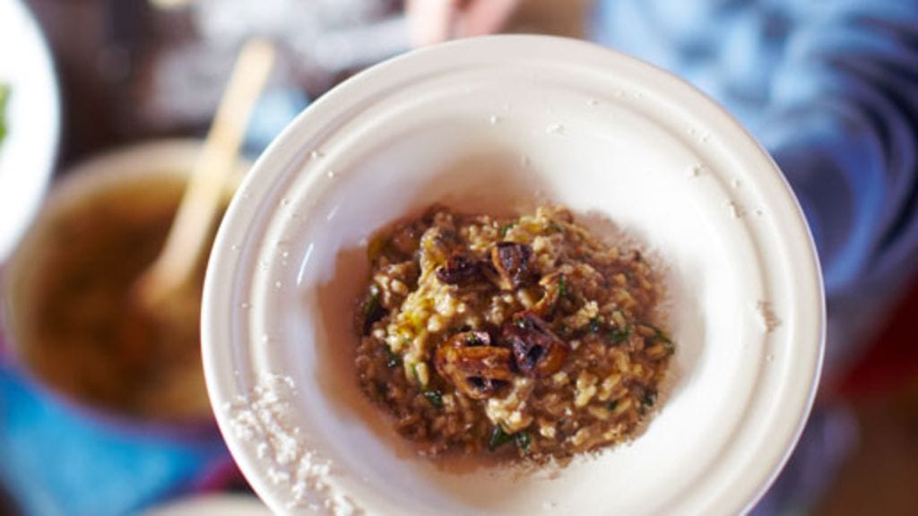 Tarjoilu: Annostele risotto kulhoihin ja lisää annosten pinnalle kourallinen sieniä. Sekoita salaatti. Viimeistele risotto parmesaaniraasteella ja tarjoile.