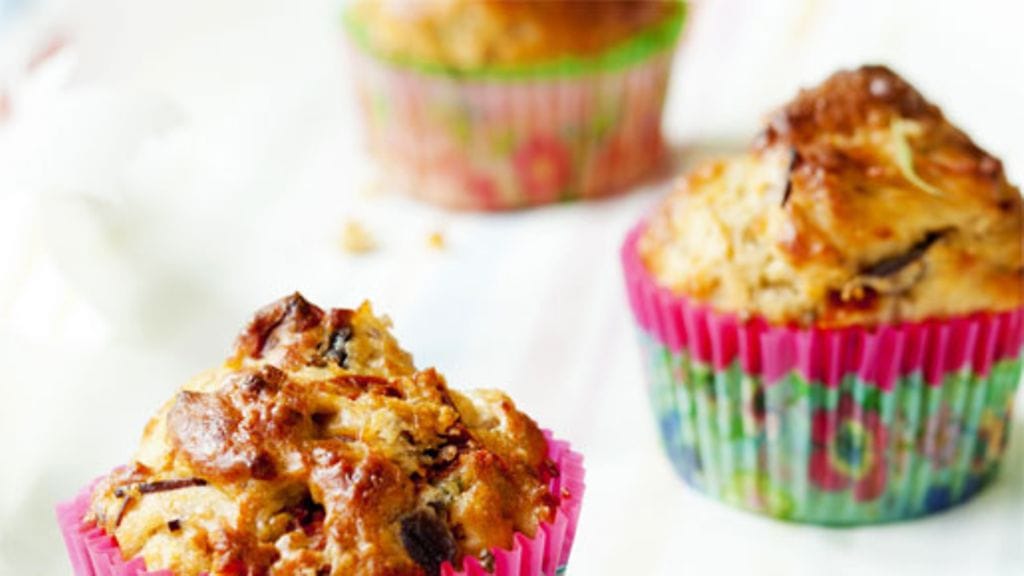 Sekoita kuivat aineet keskenään. Suikaloi kinkku, sipuli ja tomaatit. Paahda sipulit. Lisää ne taikinaan ja samaten kaikki muut aineet sekaan. Lusikoi taikina isoihin muffinivuokiin tai -pellille (voitele tarvittaessa) ja paista 200-asteisen uunin toisiksi alimmalla tasolla 15–25 min muffinien koosta riippuen.