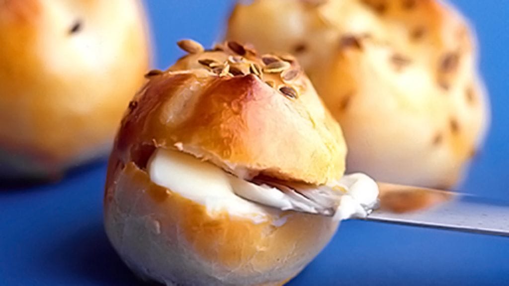 3. Penslaa sämpylät vatkatulla munalla ja ripottele päälle kuminansiemeniä. Paista uunin keskitasolla 8-10 minuuttia. Anna jäähtyä ritilällä liinan alla.