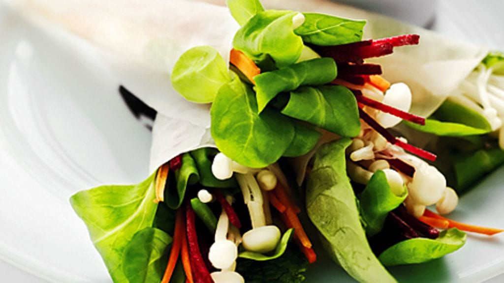 3. Kostuta riisipaperit, muutama kerrallaan, lämpimässä vedessä kunnes ne ovat pehmenneet. Laita pieni kasa salaatinversoja, porkkanaa, punajuurta ja sieniä jokaiselle arkille sekä minttua ja basilikaa. Taittele ja kääri tuuteiksi. Tarjoile dippikastikkeen kera.