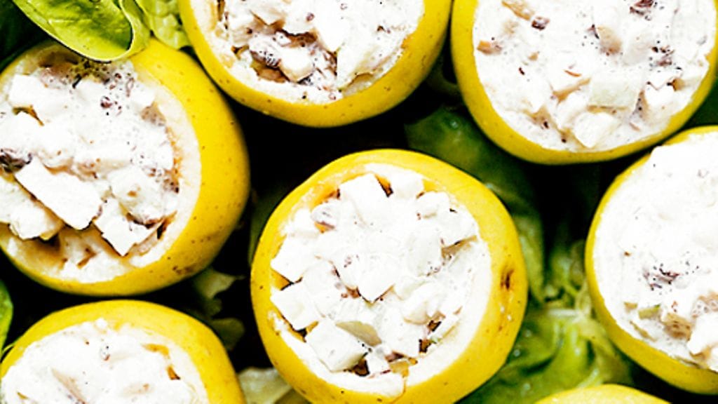 3. Lusikoi täyte omenakuppeihin ja koristele tillillä.