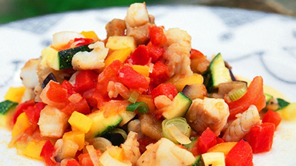 2. Kuutioi paprikat, kesäkurpitsa ja sipuli. Kuumenna pannu ja paista vihannekset voissa pehmeiksi, mutta niissä tulee olla hieman napakkuutta jäljellä.