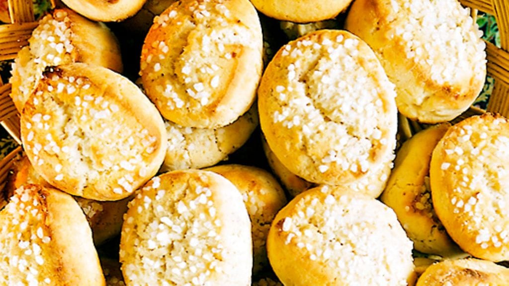 2. Pyöritä taikinasta paksuja pitkoja, paloittele ne. Kasta leikkauspinnat raesokeriin ja laita pikkuleivät leivinpaperille pellille.